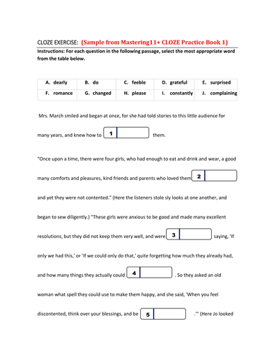 Pdf 6883 KB Eleven Plus - CEM Style CLOZE tests are now common for a number of Grammar and Selective Independent schools. Jbower New Zealand This worksheet was created by John Bower. Thanksgiving Bank On It.