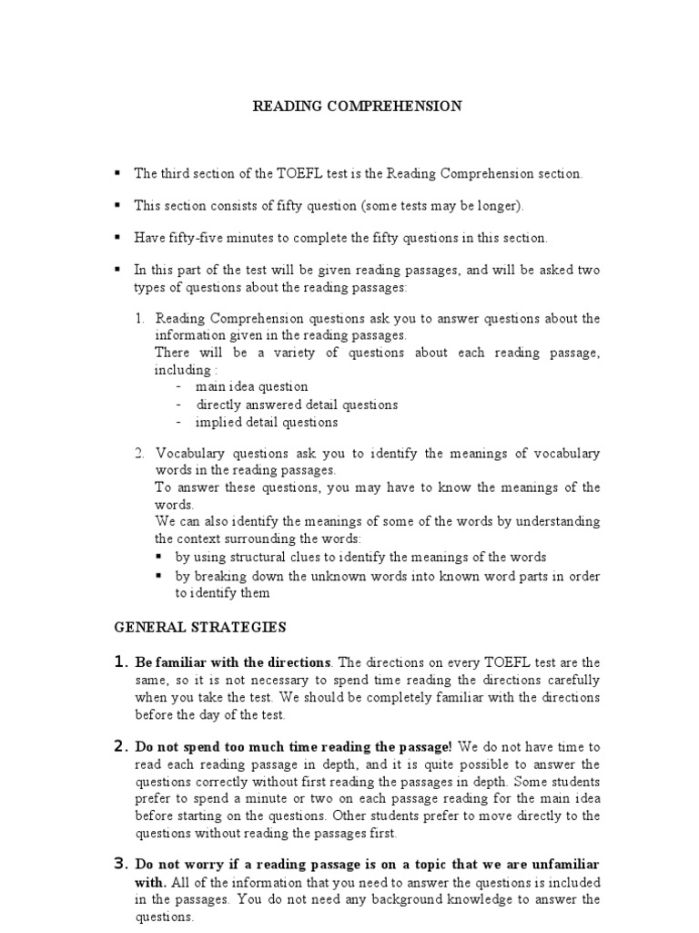 Your answer is scored on the first click. Reading Section Directions In this section you will read three passages and answer reading comprehension questions about each passage. There are two ways to train yourself for the Reading section of the TOEFL.